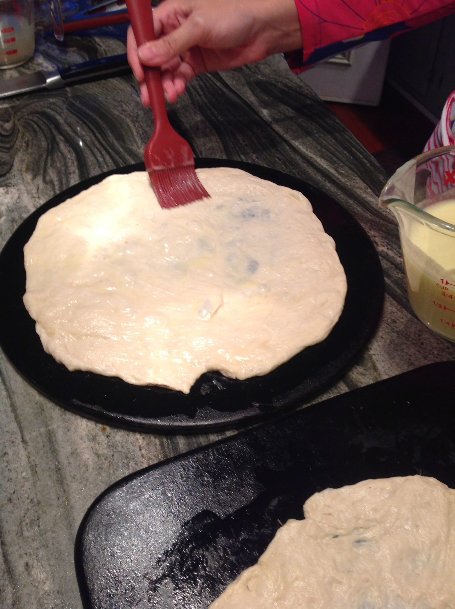 5.    Cut pizza dough in half. Working with 1 piece at a time and keeping other piece covered with a damp towel or plastic wrap, gently stretch dough into 12”–14” rounds and transfer to lightly oiled baking sheets.