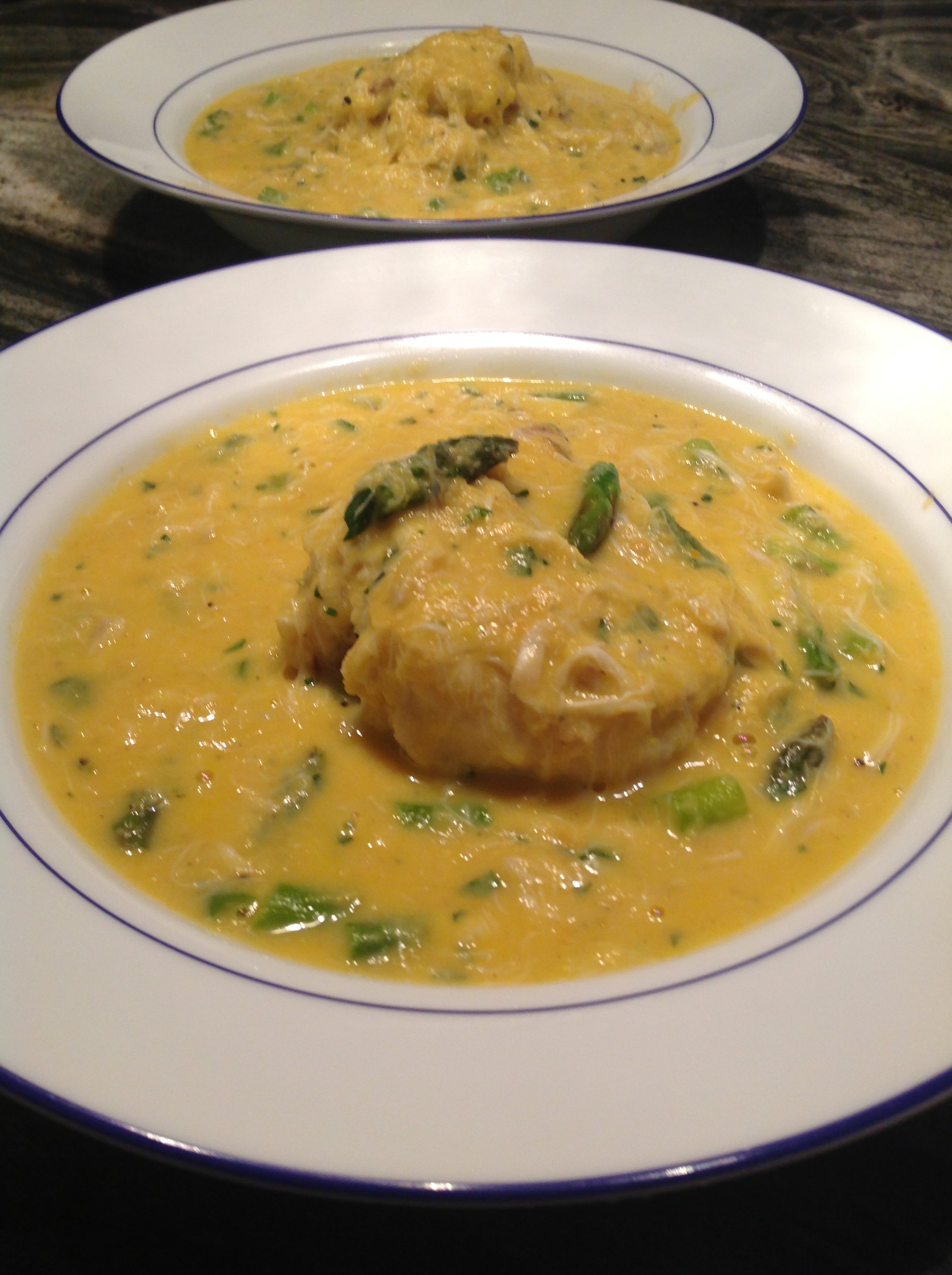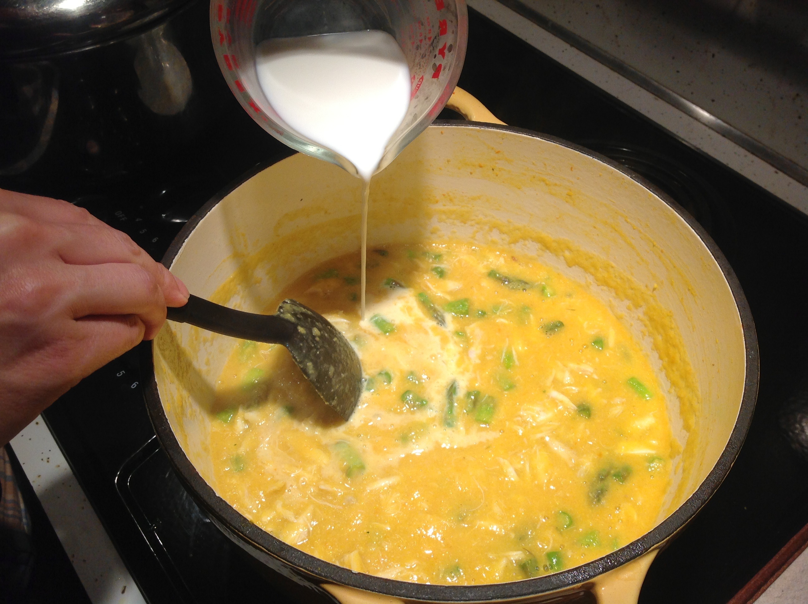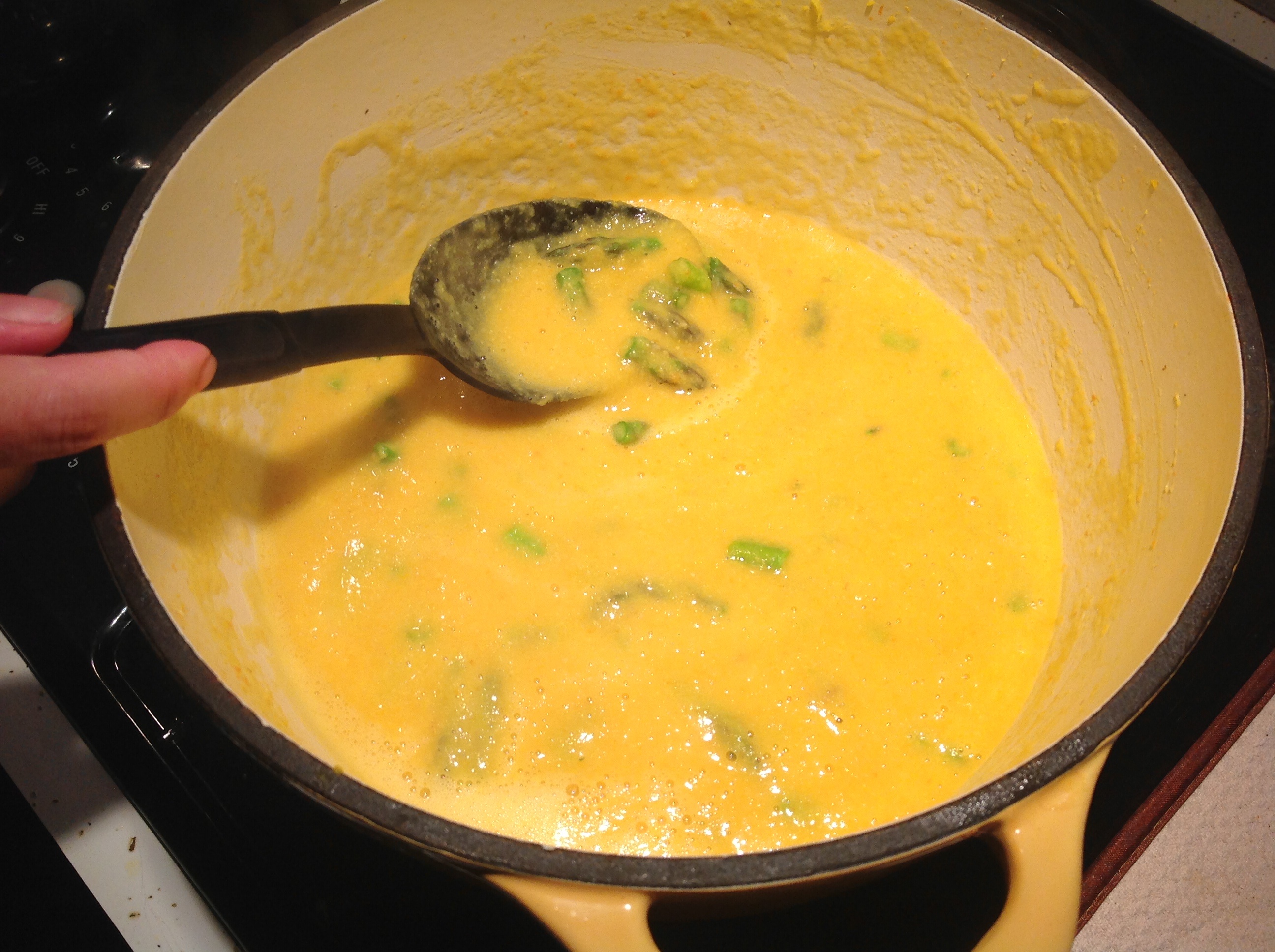 5.    Add the asparagus to the pot and simmer for 5 minutes. Add the crab and the remaining 3/4 teaspoon salt. Bring to a simmer and cook about 1 minute.