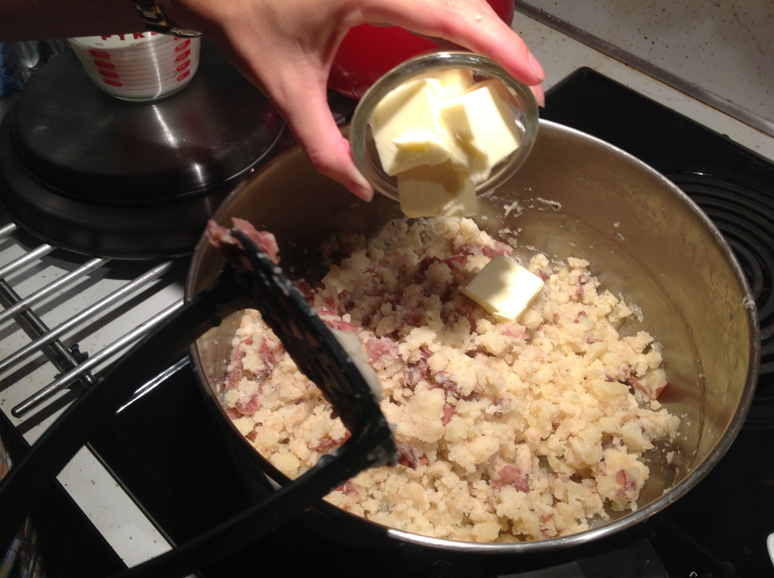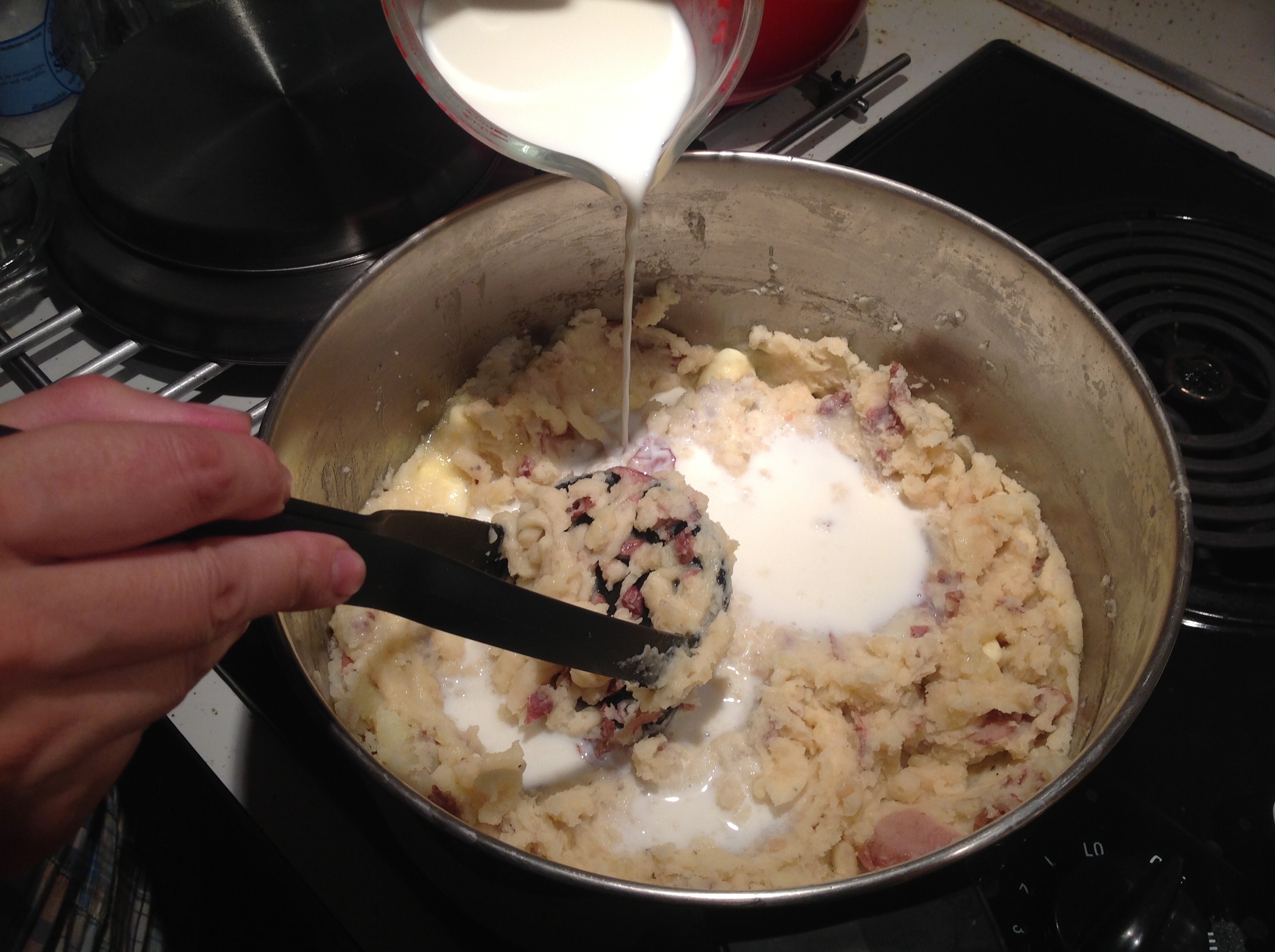 3.     Mash the potatoes over very low heat, gradually incorporating the butter and 3/4 cup of the cream. Keep warm.