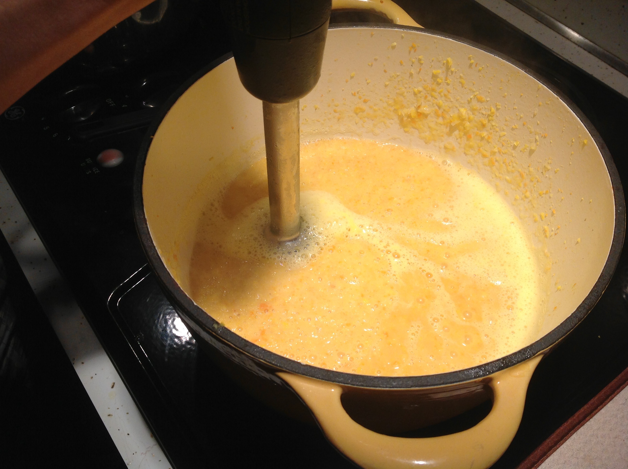 4.     Back to the chowder: Add the corn and 1/2 teaspoon of the salt to the large saucepan of broth and simmer, covered, until the corn is just tender, about 15 minutes. In a food processor, or blender, puree the chowder and then pour it back into the saucepan. I like to use a hand-held immersion blender for the purée step. It makes for an easier preparation and quicker clean up.