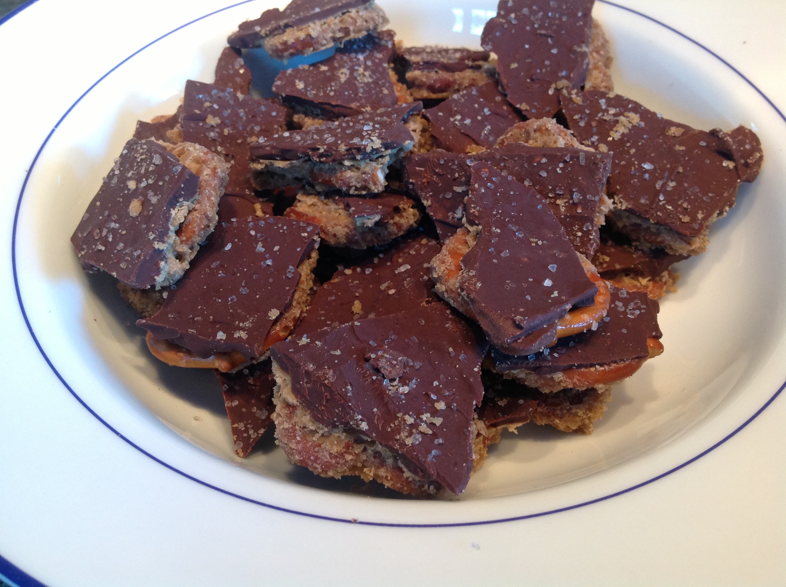 But that’s another story. Today’s post is about what Webster considers the event’s piéce de résistance – salted caramel pretzel bark – and the primary reason he anticipates this annual invasion of The Kitchen Island by waves of girlie girls and the chaos it inevitably spawns. This one is among the most simple recipes in our book so, here we go…