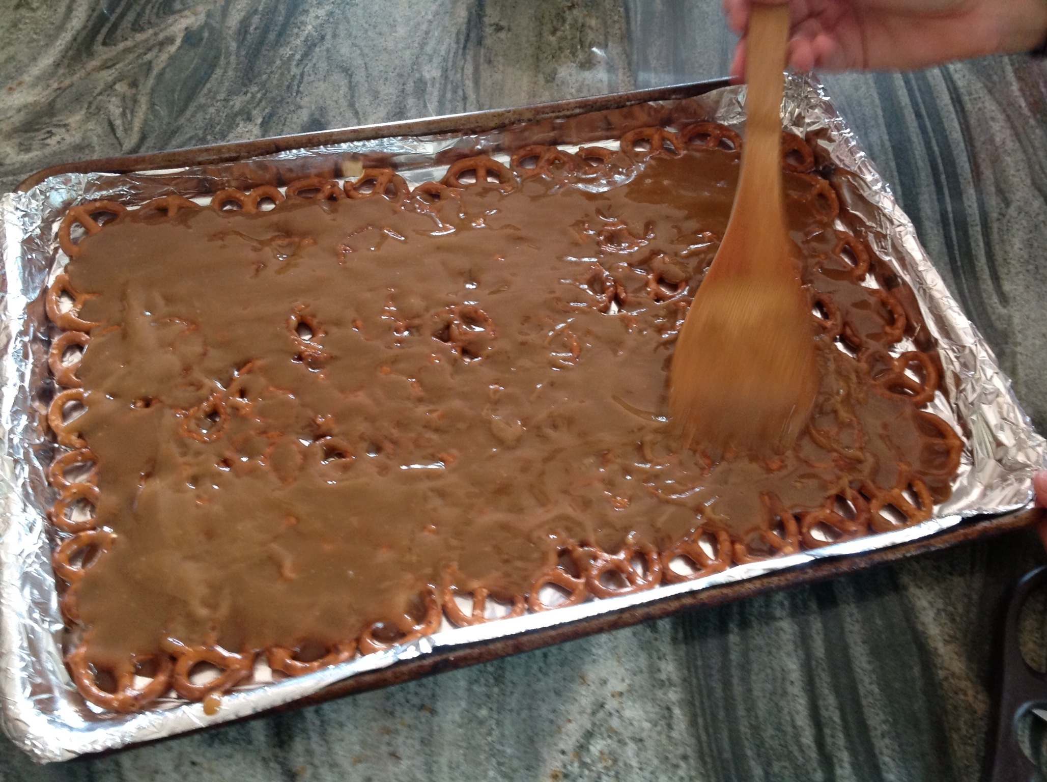 4) Pour the caramel over the pretzels. (It’s okay if all the pretzels are not covered.) Bake for 5 minutes in your preheated oven.