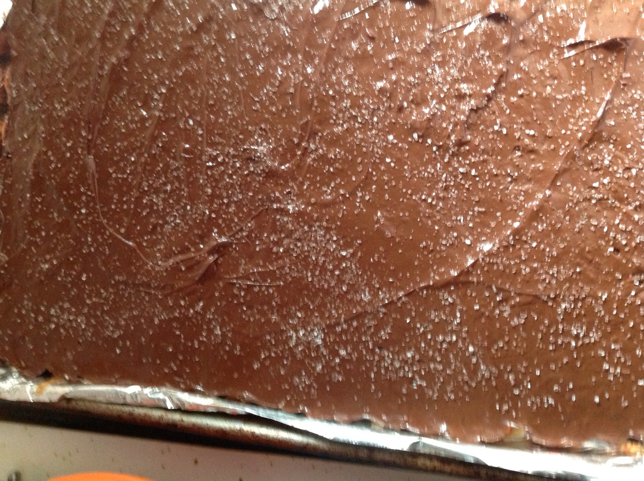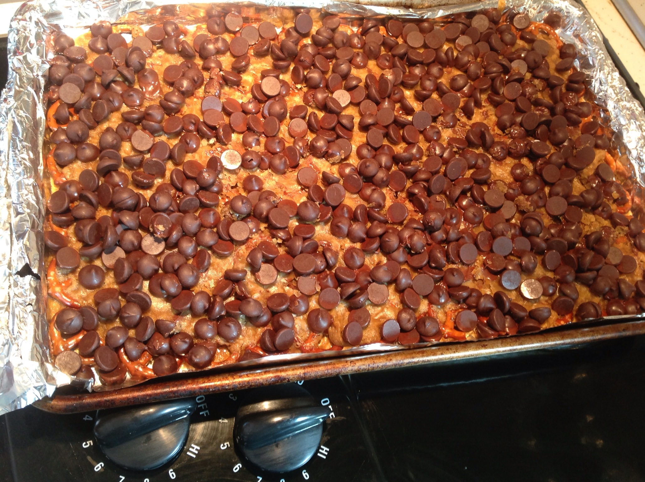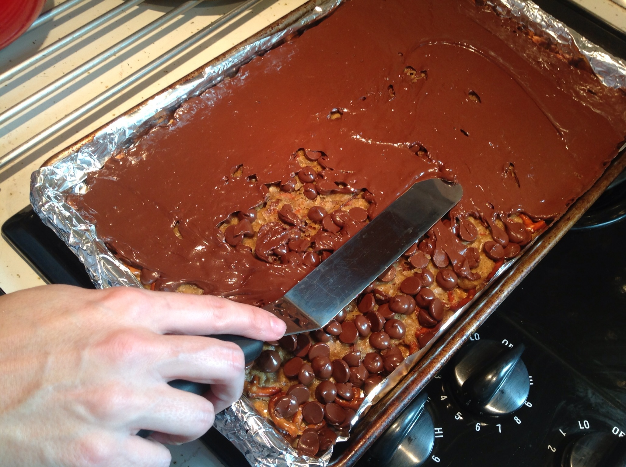6) Remove from oven and spread the gooey chocolate chips around with a spatula until most of the pretzels are covered.