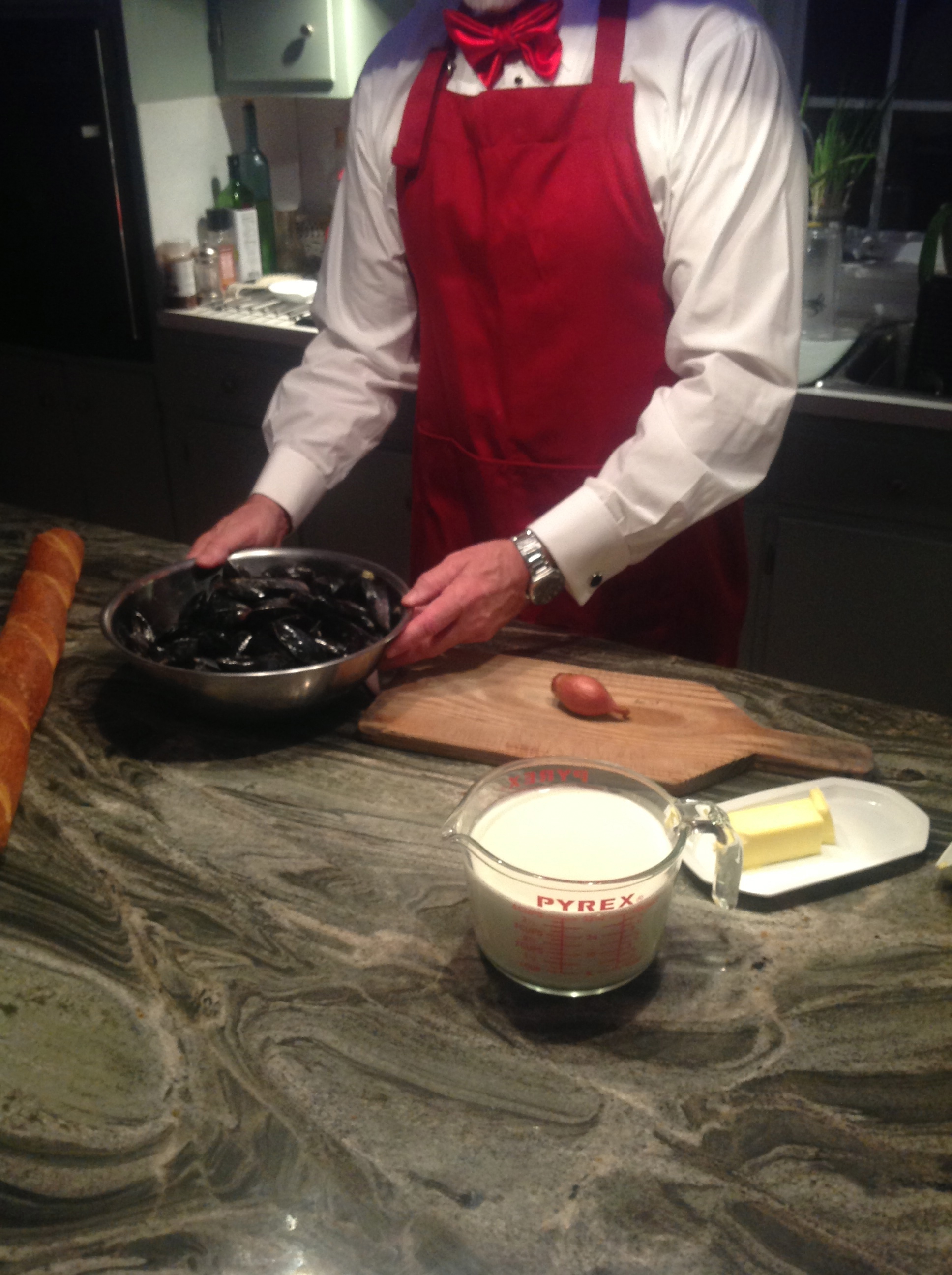 On our first Valentine’s Day together, he invited me and The Bug over for “a special dinner”. Yes, that’s right, our first Valentine’s Day included my 14 year old daughter who was not too happy with Mom’s new love interest. After assuring her that he would not be serving salmon, she graciously agreed to attend. Webster advised that we come “dressed”. The Bug decided her 6th grade formal gown was the appropriate attire while I settled for a simple cocktail dress. He greeted us decked out in a tux, welcomed us in French and presented us both with a lovely arrangement of flowers. (The Bug started to warm up to him at this point.) He told us the story of how he learned to make this dish and his “friend”, Pierre Arnaud, whom he’d apparently last heard from five years earlier. We were to experience mussels á la Pierre.