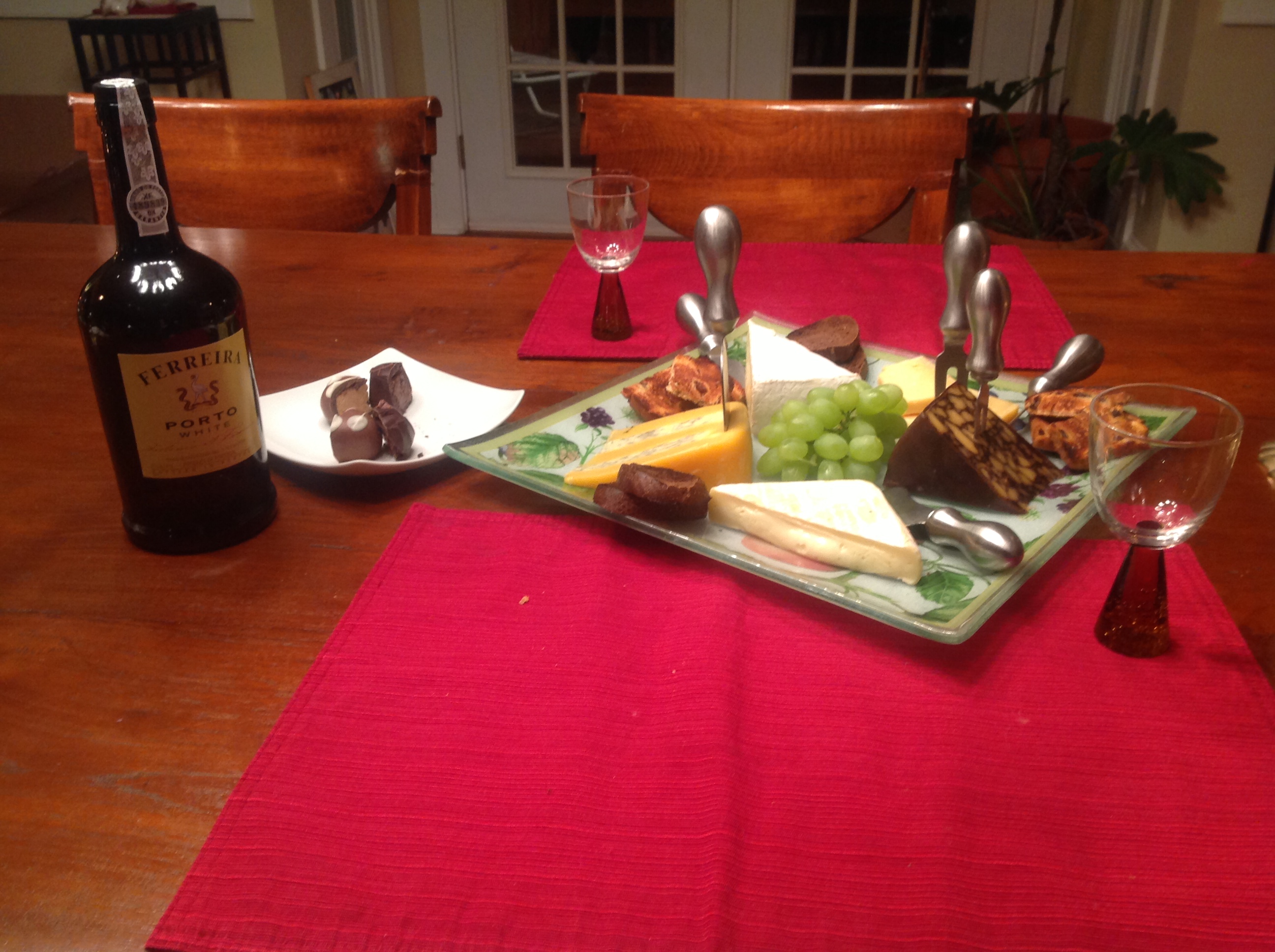 Mais, sacrebleu, mes étudiants! Don’t forget dessert! In keeping with l’atmosphère française of the evening, I wanted to replicate a component of many of the meals from my times in France and the Benelux countries, and prepared un assortiment des fromages – brie, double Gloucester with stilton, porter-infused, Appenzeller, robiola – and a couple of chocolate truffles that I served with some port.